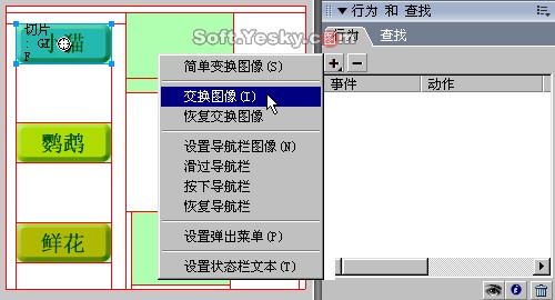 接著,點選“小貓”的按鈕切片后使用“行為”面板上的“交換圖像”指令,如圖9—12,從而啟動“交換圖像”的詳細設置對話框(圖9—15)。