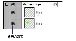 打開圖層面板點擊slice(切片)層上眼睛的圖標,就可以顯示和隱藏圖標