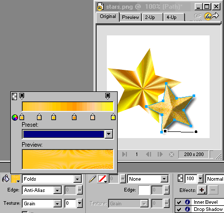 這次采用折疊(folds)填色,本例的填色依次是:#ffc820,#ffccc66,#ffcc00,#ff9900,#ffcc99,#ffff00.選中五角星,就會看到填色杠桿。