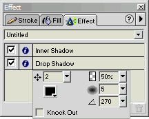 仍然選擇矩形圖形,再次使用效果面板并從下拉菜單中選擇>陰影與發光>陰影;照左圖所示選擇陰影參數;