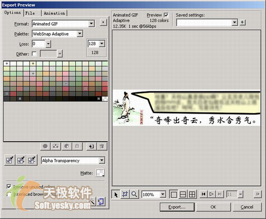 在導(dǎo)出文件類型中選擇gif動(dòng)畫選項(xiàng),用戶可以通過設(shè)置matte(色版)、colors(顏色)、dither(抖動(dòng))、透明度等選項(xiàng)來(lái)達(dá)到對(duì)顯示效果的優(yōu)化。