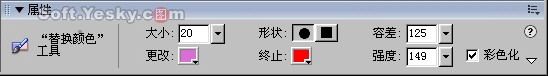在“替換顏色”的屬性框中還可以對“替換顏色”筆觸的大小、形狀、容差和強度進行設置。而“彩色化”是指用“終止”顏色去替換“更改”顏色。取消選擇“彩色化”以便用“終止”顏色對“更改”顏色進行涂染,并保持一部分“更改”顏色不變。