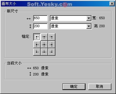 畫布大小:點擊“畫布大小”按鈕將彈出設置對話框,從中可以看到,當前畫布的寬為650像素,高是263像素。在“新尺寸”項內可以輸入新的寬、高像素。在“錨定”右邊是畫布的固定點,當畫布的大小被改變時會以選中的固定點不變來更改畫布的大小。