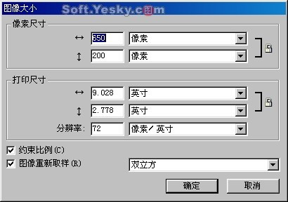 在像素尺寸項下可以設置工作區的寬、高度數值。選中“約束比例”項后,當寬度或高度中某一數值被改喲后,另一個數值也會等比例地隨著改變。如果取消此項選擇,就可以單獨改變寬度或高度的數值了。“圖像重新取樣”項是設置圖像的重新取樣功能。