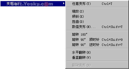 任意變形:該功能中已包括“縮放”、“傾斜”和“扭曲”功能,這些功能與工具條上的“任意變形” 系列工具是一樣的,選中后可以對對象進行隨意的大小、高寬、傾斜度和旋轉等拖拽變形。另外,也可以用工具欄上的四個常用的翻轉按鈕進行調整,如圖3—16。