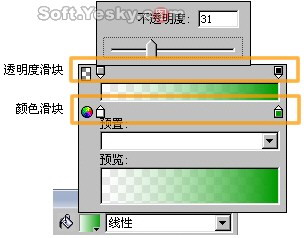 然后在填充色預覽框中設置漸變填充的色彩及透明度,如圖3—12。點擊顏色滑塊可彈出如圖3—10般的顏色預覽窗。