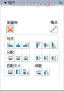 此外,通過組合面板中的“對齊面板”,也可以對選擇的對象進行各種對齊方式,其中的“到畫布”是指對象以畫布邊緣為對齊坐標。而“錨點”則可以對路徑節點設置各種不同的對齊方式。