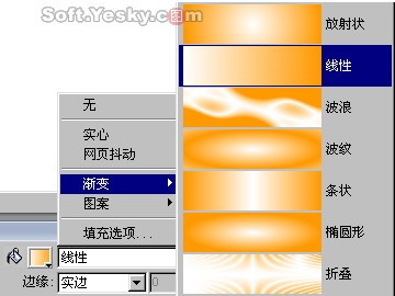 接著我們再來為該路徑設置內部的填充色。內部的填充類別分為“無填充色、實心填充、網頁抖動、漸變填充和圖案填充”五種。其中各種填充類別下又有諸多色彩和樣式可供選擇。我們先在填充選項中選擇一種填充模式,如圖3—11。