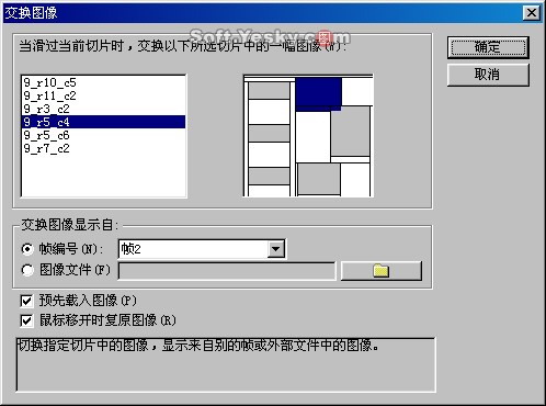 在該窗口中,左上邊所列出來的是所有切片區塊的名稱,右邊是所有切片區塊所在位置的縮略圖。在這里我們可以從中任意選擇一個圖象的切片區塊用來與“小貓”按鈕切片進行圖象交換。
