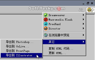 答:點擊畫布窗口右上角的下拉按鈕,從彈出菜單中選擇“freehand—導出到freehand”或選擇“其它—導出到”,都是將文件導出成.ai格式的矢量圖形。