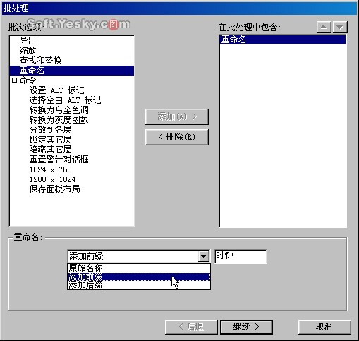 ,還可以設置執行動作時的先后順序。對于不需要的動作指令也可以從列表中選中后點擊“刪除”按鈕。在這里我們試著把剛才導入的兩張圖片的原有名稱面前加上“時鐘”兩字,然后點擊“繼續”按鈕,進入下一個設置步驟。