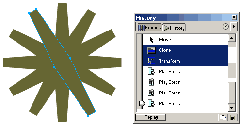 4、 打開history面板,此時您會看到history面板中了clone和transform這二個命令,按住shift鍵選擇這二個命令,然后點擊底部的replay按鈕四次。