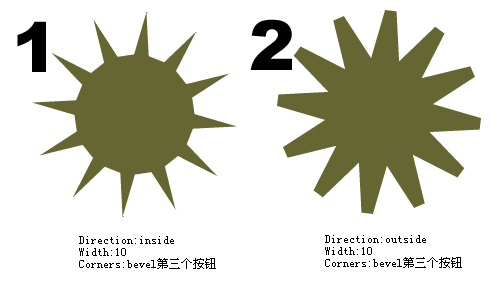 3、 在下圖(1)的路徑對象中direction值選擇的是inside(向里插入路徑),在下圖(2)的路徑對象中direction值選擇的是outside(向外插入路徑)。width寬度值同時都為10,corners選項中選的都是bevel按鈕。