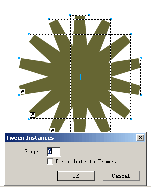 4、 全選這二個對象,使用快捷方式ctrl+a。使用菜單命令modify>symbol>tween instances,在tween instances對話框中設置steps為6,不要鉤選distribute to frames前面的選擇框,點擊ok按鈕。此時您會看到在二個六邊形實例中間又自動插入了6個六邊形實例。此時他們全處于被選擇狀態。