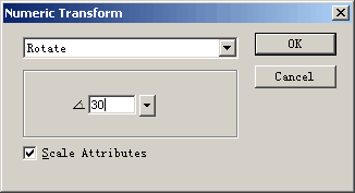 3、 使用菜單命令edit>clone克隆該六邊形,并且使用菜單命令modfy>transtorm>numeric transform。在numeric transform對話框中設置變形類型為rotate,角度為30,點擊ok按鈕,這樣剛才被克隆出來六邊形就被旋轉了30度角。