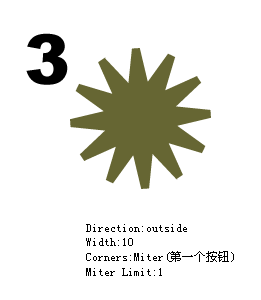 4、 在下圖(3)的路徑對象中direction值選擇的是inside,corners選的是miter 按鈕,miter limit值為1。miter limit的選項只對corners類型中的miter起作用。