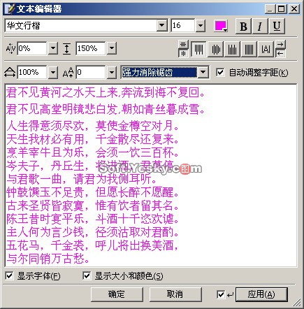 3) 再用文本工具書(shū)寫(xiě)俠客行的詩(shī)詞內(nèi)容,注意行文順序從右到左,顏色為紫色,字號(hào)為16,其他設(shè)置如圖2所示。