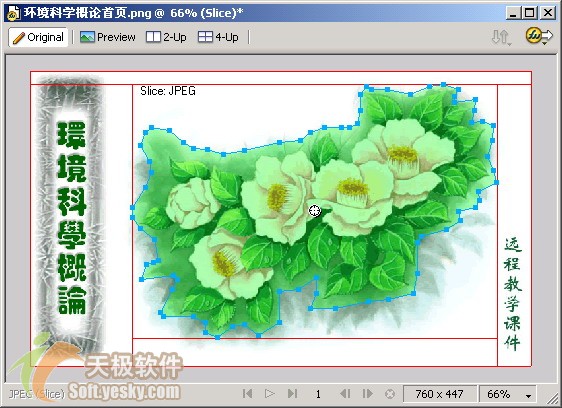 由上圖可見,圖像中的切片向?qū)匀皇撬胶痛怪钡模傻那衅募策€是矩形的。實(shí)際上多邊形切片的形狀主要是用于設(shè)置相應(yīng)的行為觸發(fā)區(qū)域的。如果切片對(duì)象被設(shè)置了鏈接,那么在瀏覽器中顯示的時(shí)候,只有點(diǎn)擊到多邊形區(qū)域時(shí)才會(huì)實(shí)現(xiàn)鏈接跳轉(zhuǎn),而在這個(gè)切片的其他區(qū)域則不會(huì)出現(xiàn)鏈接跳轉(zhuǎn)。