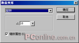 將組成放大鏡的這三個對象同時選中,并使用“修改—組合”命令,將其形成一個組合。然后點擊“修改—變形—數值變形”命令,從彈出的對話框的下拉列表中選擇“旋轉”,并設置旋轉角度為18。如圖11。