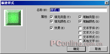 具體的操作方法是先為一個圖形對象添加各項所需的特效,然后點擊“樣式”面板右下角的“新建樣式” 按鈕,此時會彈出一個“新建樣式”的對話框。在該對話框中可以對這一圖形對象的相關屬性進行選擇,從而決定是否也將這些屬性添加到新樣式當中。若為文字對象建立新樣式時,則可以選擇是否將該文字對象所用的字體、字號等也加入到新建的樣式當中。如圖35。
