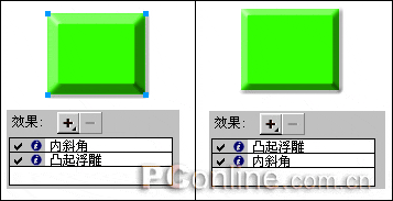 一個對象不僅可以使用多個特效,而且一個特效也可以被一個對象進行反復的添加。但要注意的是,效果欄中的特效是按時間前后進行排列的,先添加的特效在最上面,隨后添加的特效則逐步排到下面。即使對兩個相同的對象添加了相同的特效,若效果欄中的特效排列不同,這兩個對象所產生的外形效果也會不一樣的。如圖32中的兩個矩形對象,雖使用了完全相同的特效,但卻因特效的排列不同而造成外形上的差別。