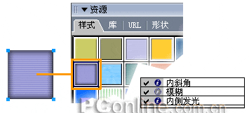 我們試著把一個圖形對象選中后在“樣式”面板中隨意為它添加一種樣式。這時我們在對象屬性框的效果欄中可以發現,這里被自動添加了一些特效。如圖34。
