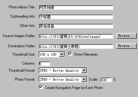 4.點擊 source images folder(源圖像文件夾) 后的 browser (瀏覽)按鈕選擇相冊的源圖像文件夾. 點擊 destination folder(目標文件夾)后的 browser 按鈕選擇保存html和處理后圖像的文件夾. |
