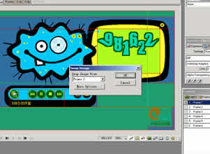 好了,回到frame1,單擊第一個按鈕,按鈕中間出現一個符號,然后是最關鍵的一步:把符號拖到黃色背景中,在隨后出現的對話框中選擇frame2。如圖三所視。按鈕到所視區域出現了一條藍色曲線,表示behaviour添加成功。其他的按鈕也是這么做,依次選擇frame2,3,4,5。