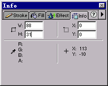 第三步、選定矩形對象,打開info(信息)面板,將w、h、x、y內各個數值框的設定值進行相應修改,來改變剛剛繪制矩形的大小和位置,使得矩形的大小正好適合編輯區的大小,具體的設定如圖02所示:
