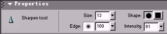 2、sharpen tool(銳化工具)。從字面上我們就可以清楚的意識到這個工具的功能應該恰恰與模糊工具相反,而是用來強調(diào)某一塊區(qū)域,并使像素突出尖銳顯現(xiàn)出來。選定該工具后,相應的properties屬性面板會如下圖所示: