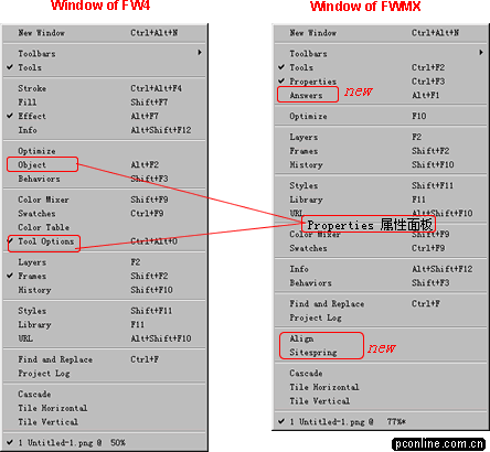 最大一個變化就是fwmx將在fw4中存在的tool options(工具選項)以及 object(對象)兩個浮動面板全部整合到了properties(屬性面板)中了,這個變化是否是一個對操作過程的簡化或者說優化,我們可以通過隨后的文章得到答案,請大家關注。