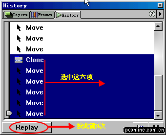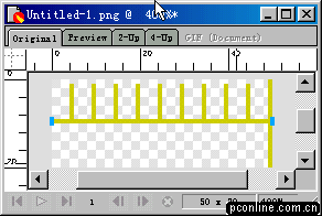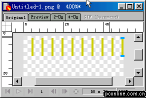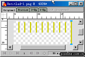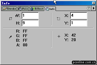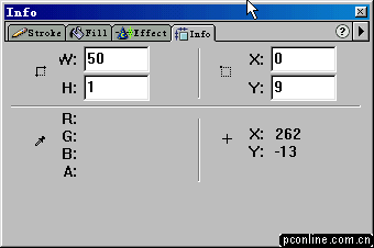 5、選中最后一個矩形(也就是最右邊的那個)。打開info面板,在h欄中輸入數字20(把該矩形的高度設置為20),然后按鍵盤上的回車鍵,我們發現該矩形高度變成20象素了。(好多朋友在信息面板中設置好寬度和長度后,總是記不得按回車鍵,卻一個勁的抱怨說改變不了長度或高度。要記住這個功能哦:),它能給您帶來許多方便)。言歸正傳,把改變后的矩形移動到y坐標置為0,x坐標置為49的位置。參照info面板。