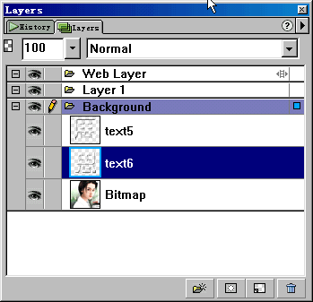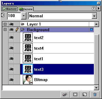 4、大家是不是克隆幾次后有些發(fā)暈了?:)。選中text3,把它拖放到text1層之下。此時(shí),text2和text3層是移動(dòng)了象素的文字層,大家要清楚。此時(shí)各層的關(guān)糸如圖。