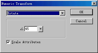 3、在正方形處于選中狀態下,執行菜單命令"modify--transform--numeric transform",在隨后彈出的對話框,選取變化的方式為"rotate(旋轉)",并且輸入旋轉的角度為45度,具體設置如下圖所示: