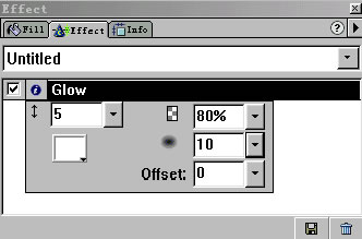 13.同時選中圓和橢圓,modify---combine---punch,這樣我們得到了一段圓弧,選中該圓弧,打開effect面板,shadow and glow---glow, 在彈出的框中如下圖設置,然后在圖層面板中把它的透明度設為80。把它移到左邊。玻璃的反光效果就出來了。