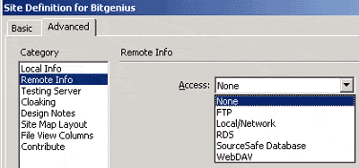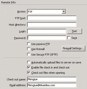 不過很多人會發現它是灰色不可用的,這是因為我們還沒有建立一個可用的站點,或者說我們當前的文件不在一個可識別的站點中,使用fw的站點管理功能,首先必須建立一個fw可識別的站點,而這個站點的建立是由dw來完成的,所以我們先來在dw中建立一個站點。fw要求在dw中建立的站點必須包含一個遠端站點的定義,如下圖: