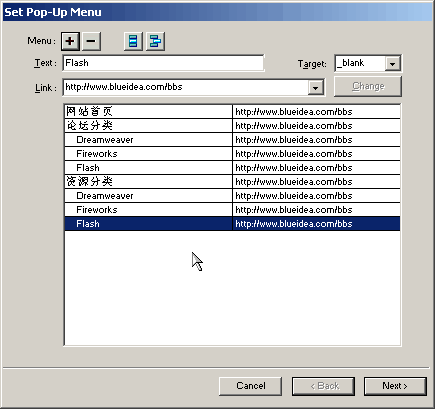 大家可以在text中設置條目的文字名稱,在link中設置條目的鏈接路徑,在target中設置打開鏈接的目標窗口,設置完后點一下"+"按鈕就可以生成一個菜單條目了;如果想刪掉,點中條目,再點"-"按鈕就可以刪除條目;如果想修改條目設置,只需點中條目,修改各項設置后點change按鈕即可。fw4的彈出菜單是可以做多級