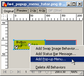 這時,將鼠標移到按鈕對象中間的圓形標志上鼠標會變成手形,單擊圓形標志,在彈出菜單中選擇add pop_up menu…,