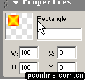 3、選取工具箱的矩形繪制工具,在編輯區繪制一個任意大小的矩形,然后在properties(屬性)面板上的info區域進行具體設置,將w(寬)、h(高)值均設為100,將x、y值均設為0,這樣,我們就得到了一個位于編輯區左上角、邊長為100像素大小的正方形。具體設置如下圖所示: