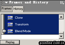 9、打開history(歷史)面板,配合shift鍵,同時選定我們剛剛操作的上面這三個步驟:“clone、transform、blend mode”,單擊歷史面板左下角的“replay”按鈕,如下圖所示: