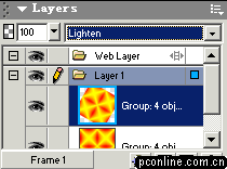 8、選定編輯區的組合對象,執行菜單命令"edit / clone",原地克隆復制一個組合對象,接著執行菜單命令"modify / transform / numeric transform",在彈出的對話框中選擇變形方式為rotate(旋轉),輸入旋轉的數值大小為"30",其余不作調整,點擊確定即可,這樣就將克隆對象順時針方向旋轉了10度,打開層面板我們可以看到目前編輯區兩個對象的位置關系。選中克隆的對象所在的層,單擊混合模式的下拉菜單,選擇混合模式為lighten(加亮),如下圖所示: