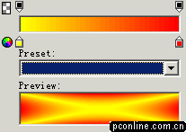 4、對矩形的填充方式進行調整,同樣在properties屬性面板上進行調整。將填充方式設為starburst方式,單擊填充顏色井,在彈出的顏色設定框中進行設定,本例是將左側的顏色塊設為了黃色,右側的顏色塊設為了紅色。當然,您可以根據實際情況進行任意調整。本例具體設置情況如下圖所示: