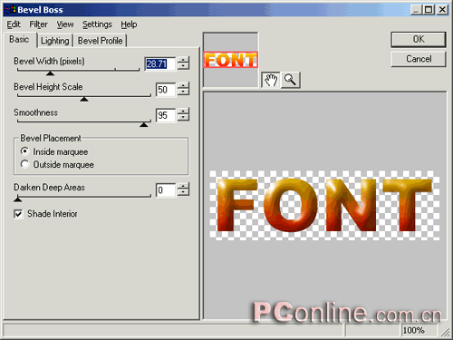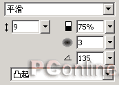 6、仍然選定位于上層的文本對象,選擇屬性面板上的效果菜單中的“eye candy 4000 le|bevel boss”效果命令,在彈出的“bevel boss”設(shè)置框中進行相關(guān)設(shè)定。注意將“bevel width”的數(shù)值設(shè)定的較大一些,從而實現(xiàn)較強烈的立體感。本例具體設(shè)定如下圖所示。
