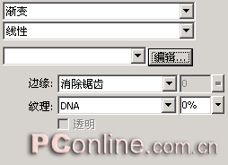 3、選中克隆的文本對象,調(diào)整其填充顏色。單擊屬性面板上的填充顏色井,在彈出的顏色設(shè)定框中,單擊“填充選項”按鈕,這樣就可以切換到具體的顏色設(shè)置面板,如下圖所示。將填充方式設(shè)為“漸變”方式的“線性”填充,單擊“編輯”按鈕,彈出漸變顏色編輯框,將漸變色設(shè)為“紅色-黃色”方式的漸變。
