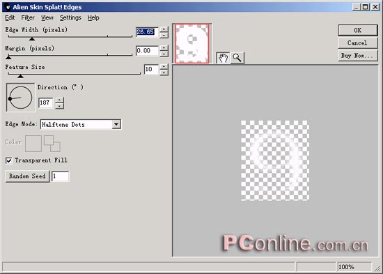 4、選中克隆對(duì)象,選擇屬性面板上的效果菜單中的“alien skin splat le | edges……”效果命令,在彈出的alien skin splat edges設(shè)定窗口中,進(jìn)行如下圖所示的設(shè)定。最終效果的形成與“edge width”和“feature size”兩項(xiàng)數(shù)值的設(shè)定是有很大關(guān)系的。