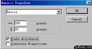 五、在數字變形對話框中進行如下設置。在下拉菜單中選擇resize(調整尺寸)。取消對constrain proportions的取消,這樣的話對象的長和寬就不用成比例進行縮放了,否則你調整一個,另一個也會跟著比例進行調整。在寬度的文字輸入框中輸入200。點擊ok按鈕。