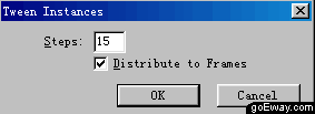 七、此時二個實例都處于被選擇狀態,使用菜單命令modify->symbol->tween instances。在彈出的fireworks4的警告窗口中點擊ok按鈕。在實例對話框中設置steps為15,選定distribute to frames。這樣這些生成的實例就會分布到每個幀中去。點擊ok按鈕。
