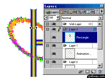 十三、在layers面板中選擇layer3。按下ctrl+v,粘貼剛才所復制的漸變色矩形,用指針工具移動到如下圖所示的位置。因為layer3處于目前的最高層,所以它在所有對象的上面,覆蓋住了文字層。