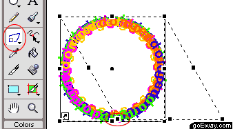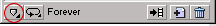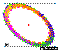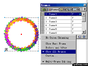 七、這樣一個文字轉動的動畫就做好了,如果想查看的話,可以點擊狀態欄中的白色播放鍵進行預覽。 八、繼續我們接下去工作吧。打開frame面板,點下圖用紅筆圈出來的這個按鈕,在彈出來的面板中使show all frames和multi-frame editing前面打上鉤,如果前面沒鉤的話,單擊該選項就可以了。此時會顯示出所有幀中的內容,重疊在一起,看下圖所示。