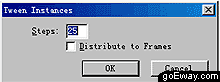 六、這時二個物體都處于被選擇狀態,使用modiy菜單->symbol->tween instances命令,此時會跳出tween instances的對話框。我們在steps中輸入25,注意distribute to frames前面的鉤不要選上,如果選上了的話,就會變成25個幀,成動畫效果,我們這兒需要的是平面的效果。
